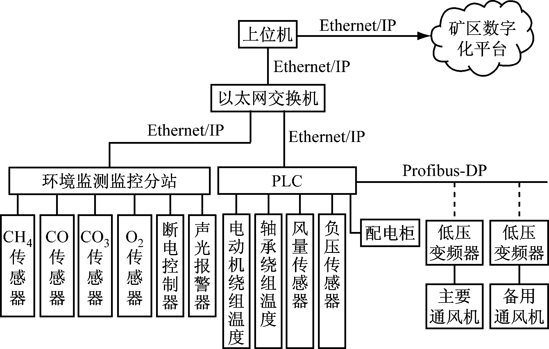 智能监控系统采用可编程序控制器PLC+上位监控计算机模式[2]。PLC部分由机架、电源模块、CPU模块、以太网模块、通信模块及输入输出模块等组成。通风系统环境参数的实时监测采用KJ95N系列矿井安全监测监控系统实现。上位监控计算机采用工业计算机,通过组态软件实现系统参数显示、故障报警、历史数据存储及报表输出等。智能监控系统硬件组成如图2所示。