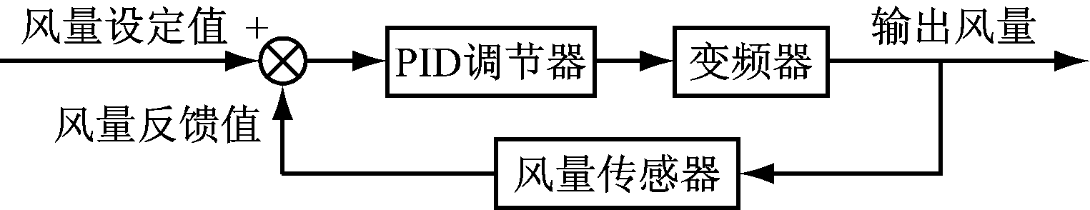 智能监控系统软件分为下位逻辑控制程序和上位监控显示程序2个部分。下位逻辑控制程序利用SIMATICSTEP7软件编制,由主程序和子程序组成。主程序用于控制配电柜、变频器等设备,完成通风机的远程遥控/自动/手动(检修)状态下的启停及风量自动调节。子程序用于实现故障报警控制及风电瓦斯闭锁控制等。其中,风量自动调节以工艺专业计算值为系统给定值,通过PLC的PID处理模块自动调节控制输出。盾构斜井施工不同风筒长度通风机供风量见表1。风量自动调节框图如图3所示。