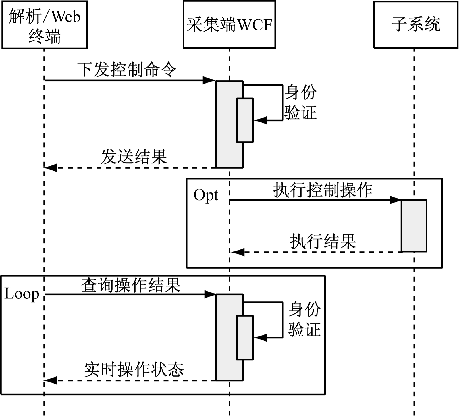在采集端根据每个子系统的特点,并在与厂家沟通协商的基础上,为子系统实现一个联动控制WCF服务,而且该服务必须继承和实现ILinkageControl接口。ILinkageControl接口从一定程度上规范了数据结构和交互方式,为平台的自动、半自动和手动控制提供了一个较为规范的操作方式,减小了系统耦合性。在ControlCommand类中的控制对象(Target)和控制命令(Command)都是string类型,每个具体的系统可能会采用不同格式,这个由采集模块规范后提供给平台上层,由解析和Web终端按照具体系统的格式调用传输命令。采集端联动控制序列如图3所示。