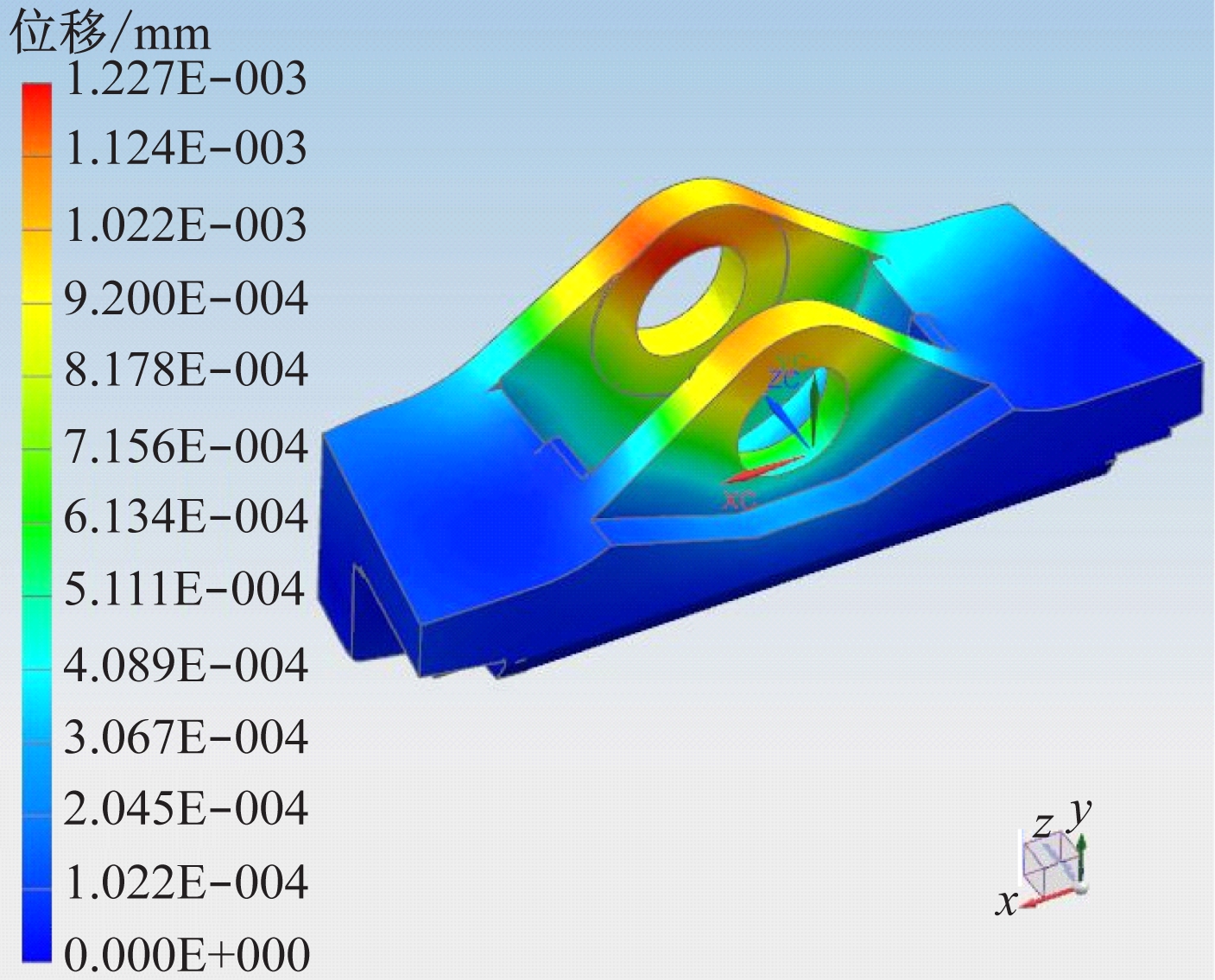 以采煤机牵引部导向滑靴为例,设置约束为沿导轨两侧及顶端固定约束,在连接耳处内圆面承受采煤机自身重力和运行时的行走阻力。在建模环境下,依次点击“采煤机关键零件参数化建模与分析系统”→“采煤机外牵引部”→“导向滑靴”,在弹出的子菜单中依次执行“导向滑靴参数化”、“创建有限元Fem模型”、“创建仿真Sim模型”命令,并在弹出的“导向滑靴仿真Sim模型参数设置”对话框中选择解算方案类型为线性静力学,系统界面如图5所示。单击“有限元模型检查及解算”,在弹出的解算监视器中可看到解算方案信息及稀疏矩阵求解器等信息,待作业完成后通过NX NASTRAN后处理功能即可查看相应的位移、应变、应力等云图,其中导向滑靴位移云图如图6所示。