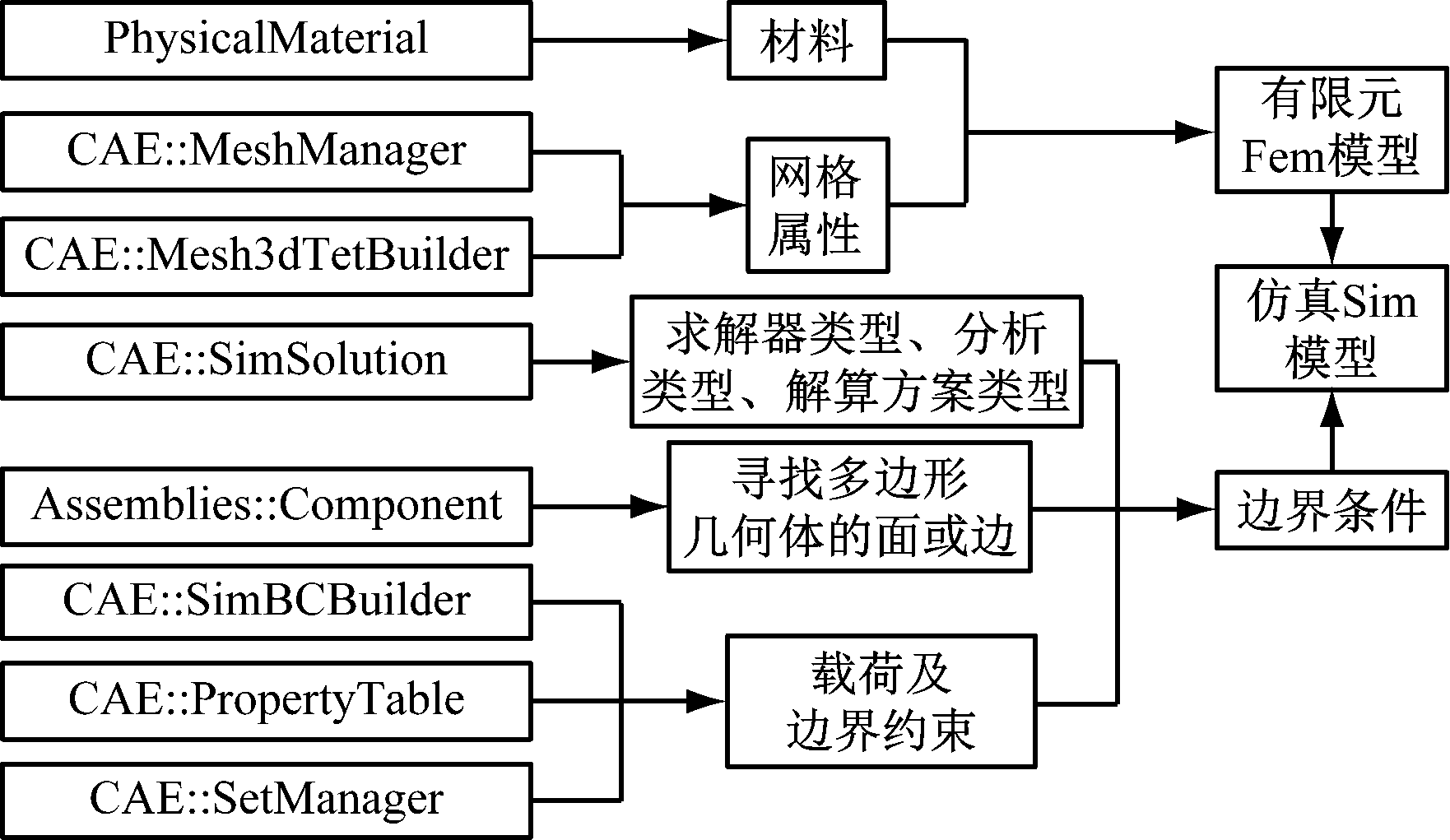 利用C++语言创建参数化有限元分析程序时,首先要获取NX的当前会话及工作和显示部件,然后创建相关类的对象,并通过指针调用类成员函数,将成员函数的输入参数和UI界面中用户的输入参数相关联,完成有限元分析的前处理,最后将生成的动态链接库文件保存在application文件夹。参数化有限元模型建立流程如图4所示。