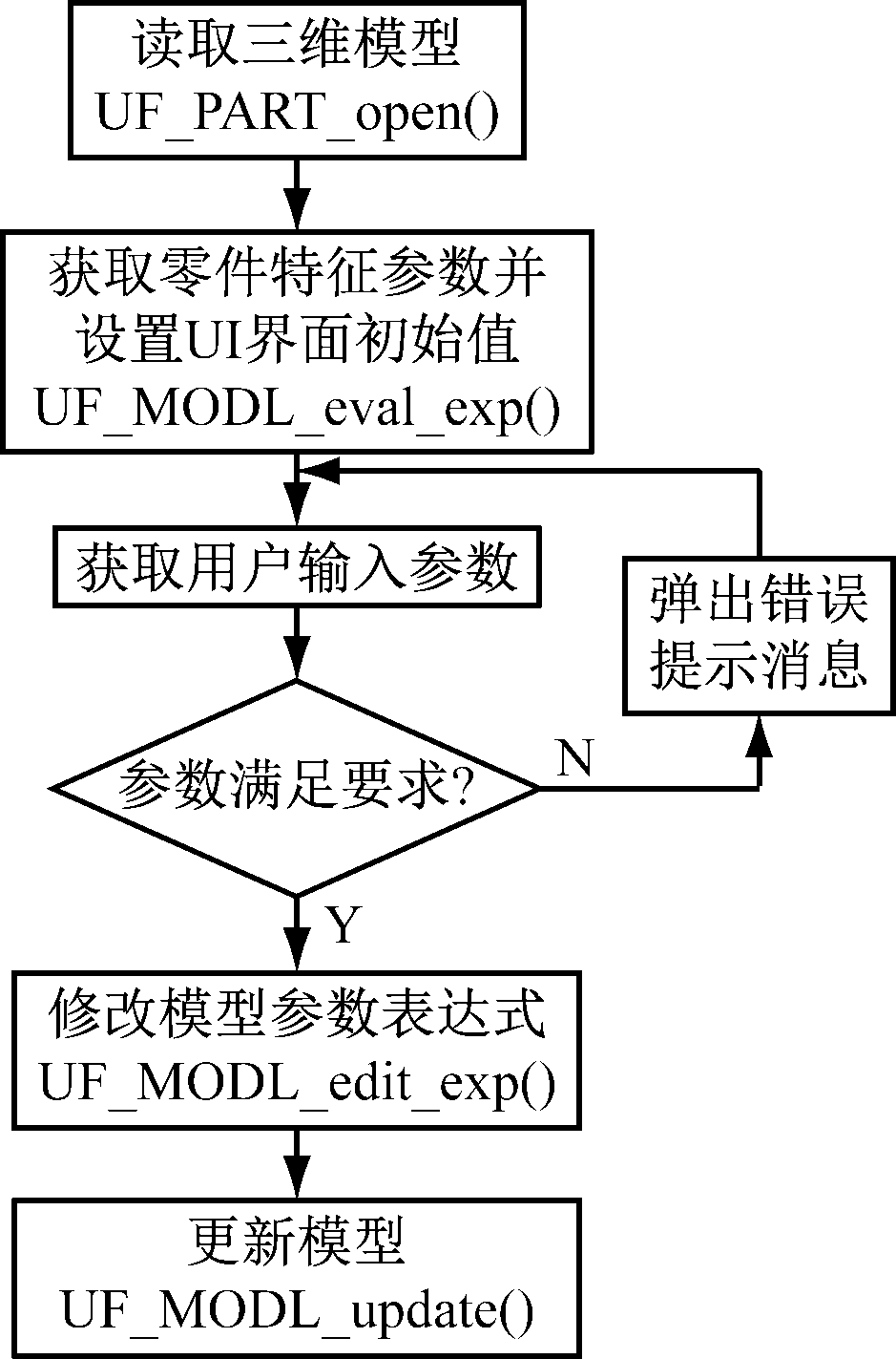 通过Visual Studio 2012建立NX9 Open Wizard项目,选择C语言为开发语言,删除项目自动创建的.c文件,并将由UI Styler得到的头文件和模板文件添加到项目中。添加必要的头文件并编辑回调函数,编译、链接生成.dll文件,并将文件保存在startup文件夹。参数化建模流程如图3所示。