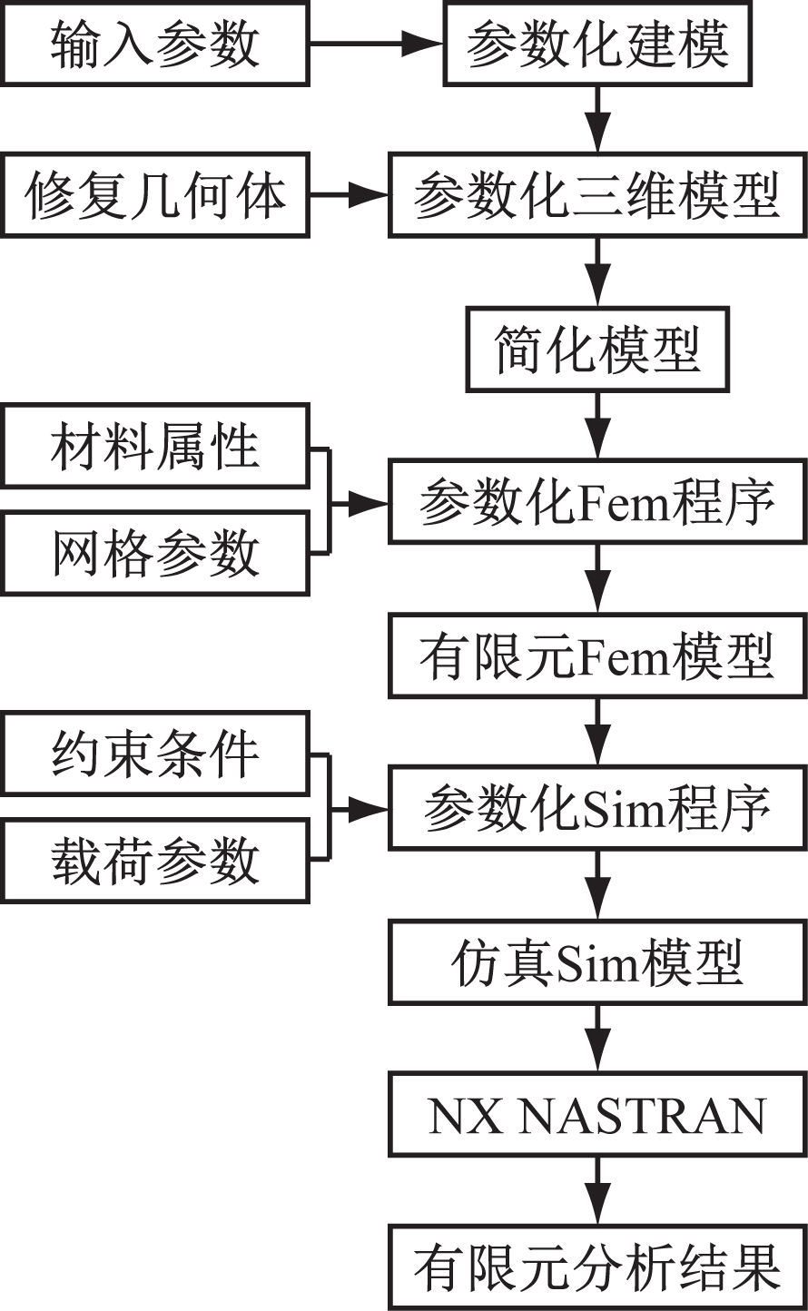 采煤机关键零件参数化建模与分析系统总体设计流程如图1所示。首先根据用户输入参数生成参数化三维模型。调用NX中自动修复几何体命令,通过设置凸台、倒角、倒圆等小特征的阈值,去除并修复对分析结果影响不大的特征,以生成简化模型。由于采用NX NASTRAN为解算器对模型进行有限元分析时,通过指派材料、创建物理属性表及网格收集器建立的有限元Fem模型和通过施加边界约束条件及载荷建立的仿真Sim模型是在不同环境中进行的,所以对这2个过程分别处理。同时要将零件的受力和约束特点与工程实际相结合,以确保在有限元分析过程中施加正确的边界条件。对于不同的零件,其约束的施加、力的作用位置和类型均由程序事先确定。