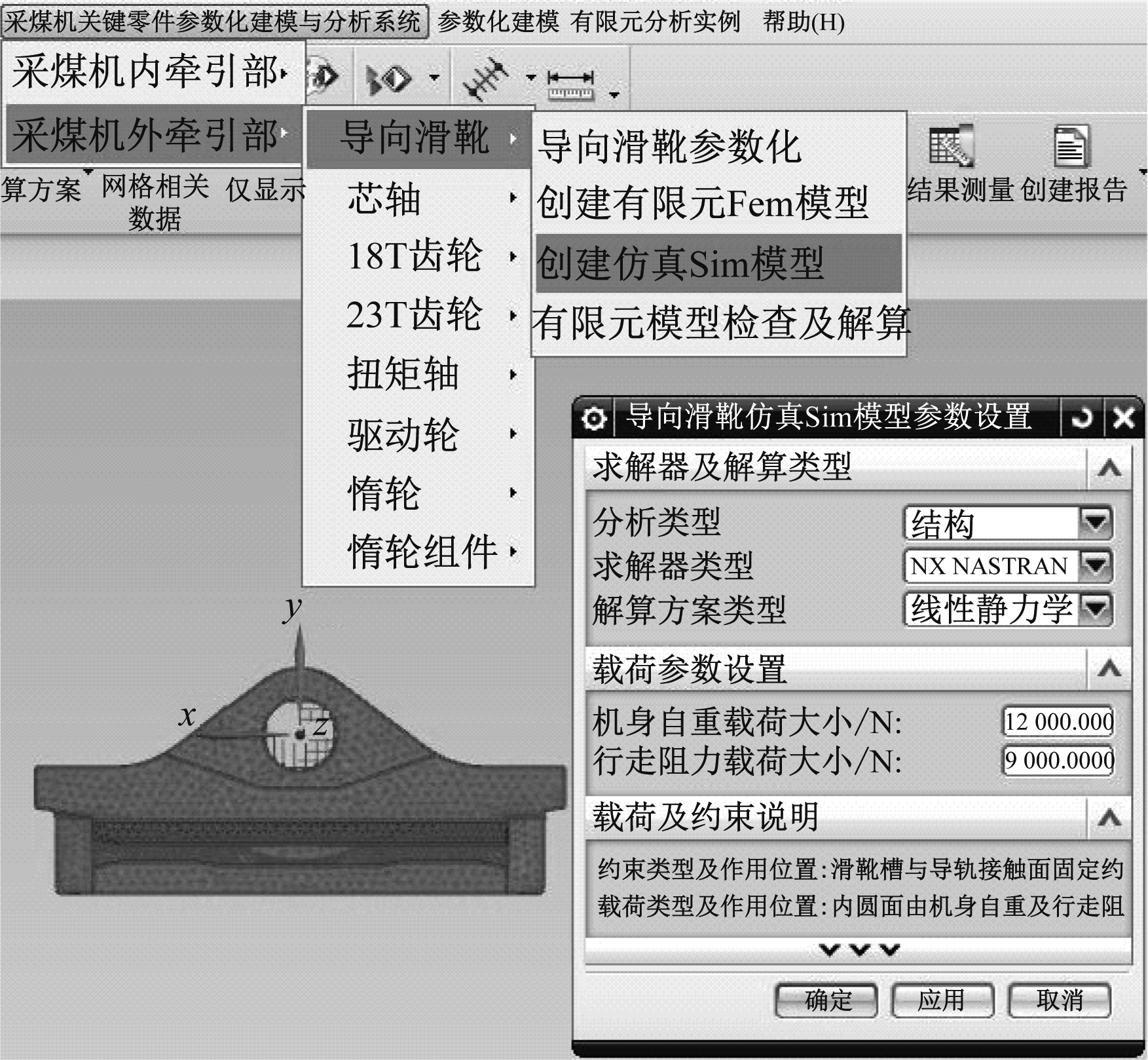 采煤机关键零件参数化建模与分析系统包含采煤机关键零件参数化建模及有限元分析程序,用户通过点击系统菜单中相应的选项,在弹出的交互式对话框中输入相应参数,点击“确定”或“应用”按钮便可实现零件建模或有限元分析功能。