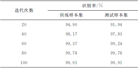 在神经网络训练中一个重要的参数是训练的迭代次数。迭代次数过小会导致网络的预测误差过大,对输入无法充分学习,导致最终多层的深度学习算法的分类准确度过低;迭代次数过大会导致计算时间过长,得到的准确率只有微小的提升。表2显示了迭代次数与识别率的关系,识别率是在迭代次数一样的情况下,取5次训练的平均结果。从表2可以看到,随着迭代次数的增加,准确率会趋于稳定,并最终收敛。为了减少实验的计算时间,在实验中取迭代次数为100,此时的准确率较高且计算时间也较短。从表2可看出,神经网络对输送带数字区域检测的正确率可达到99.91%。神经网络能够以较高的可靠性区分出输送带图像的数字区域和非数字区域,平均耗时为0.001 3 s。