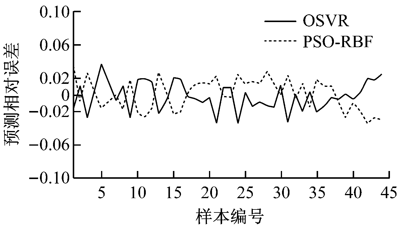 由图4和表2可知,2种模型的相对误差差别不大,但OSVR模型训练时间明显短于PSO-RBF模型训练时间,证明了OSVR模型的优越性。