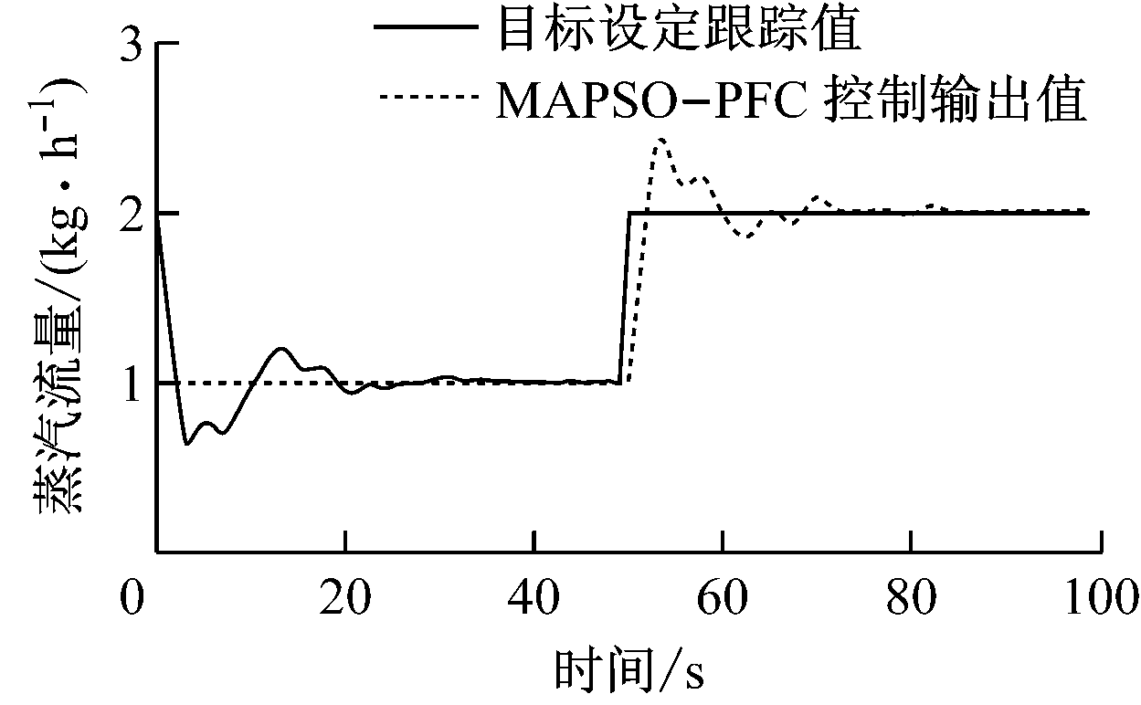 OSVR模型实现了系统动态调整和参数的在线更新,在此基础上,用MAPSO-FPC对煤调湿系统蒸汽流量进行多Agent粒子群优化预测函数控制,并与传统的PID控制比较。设预测步长p=10,控制步长H=1,给定信号为幅值在1和2之间、周期为100 s的方波信号,柔化系数αr=0.3。