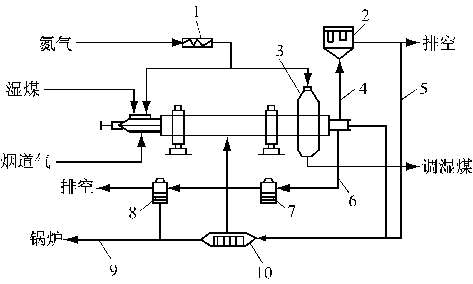 1-氮气加热器;2-布袋式除尘器;3-转筒干燥器;4-烟道气;